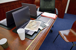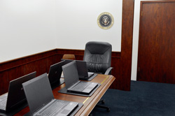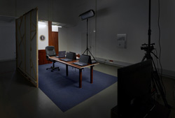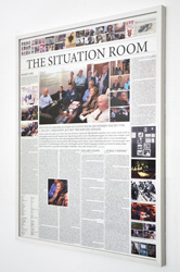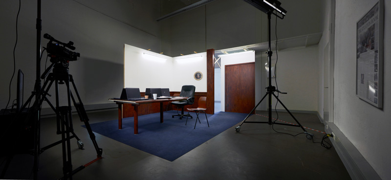 THE SITUATION ROOM ist eine reale Filmkulisse: sie besteht aus Rigips-Wänden und Holzdekor-Folien, aus Papp-Laptops und Papier-Bechern ohne Böden auf einer Sperrholz-Tisch-Imitation. Nur der in der Original-Aufnahme deutlich sichtbare Büro-Sessel ist ein echter Büro-Sessel. Zusätzlich stehen in der Installation fünf dezente Stühle an Stelle der in der Aufnahme sitzenden Personen.